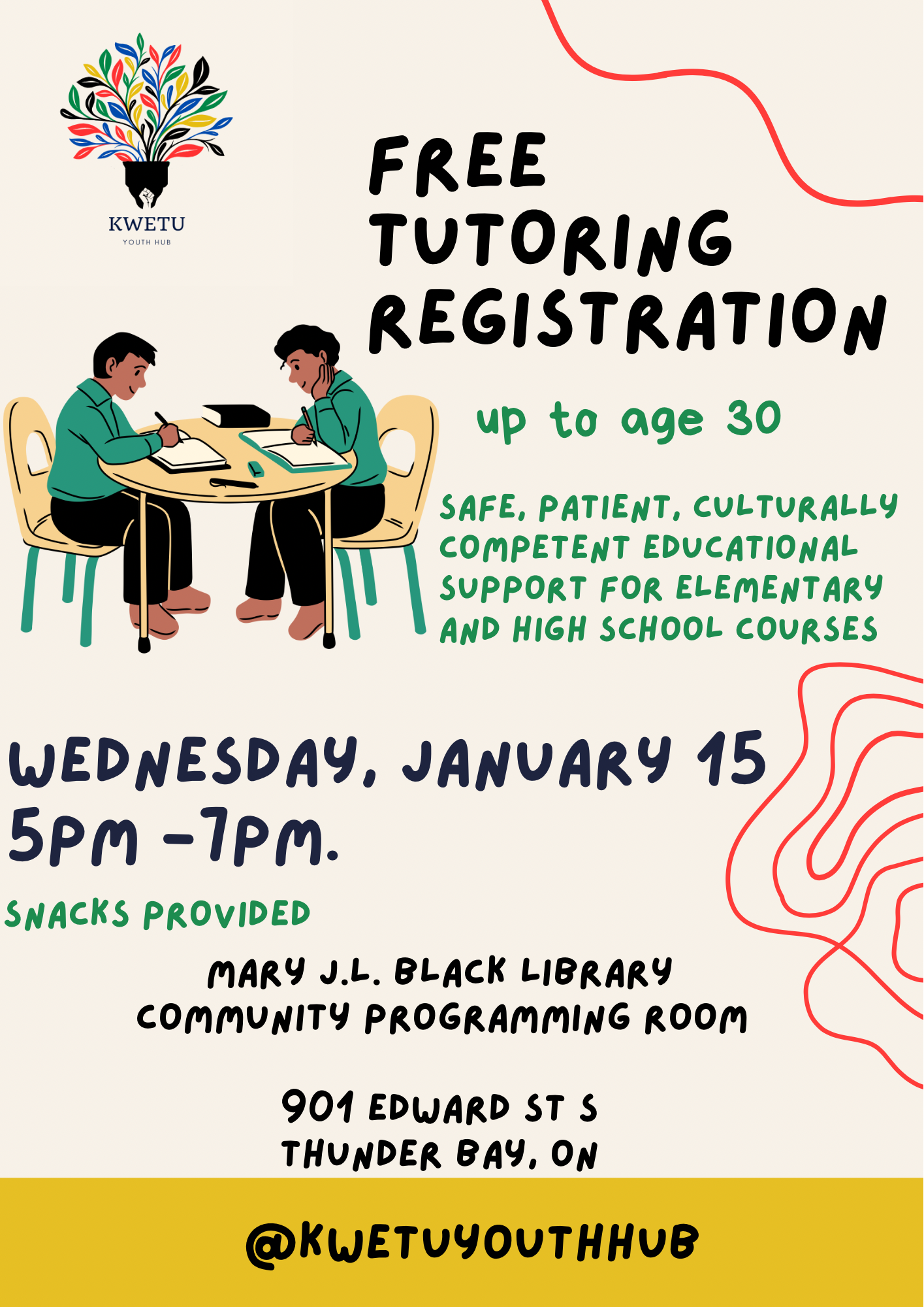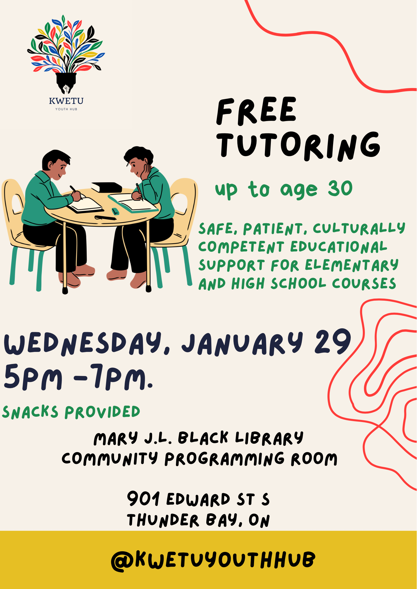 Free tutoring will be running on the South side of town on January 29 in the Community Programming Room at Mary J.L. Black Library from 5:00-7:00PM. Tutoring is open to all youth up to age 30 (inclusive), and covers elementary and secondary level courses.