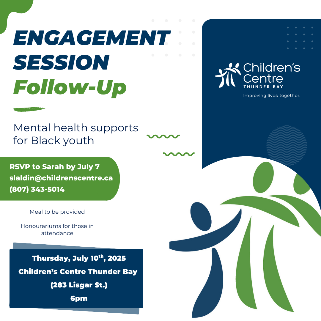 In collaboration with Children’s Centre Thunder Bay, we invite members of the community to join us to share your thoughts and work with us to co-create the way forward to improve CCTB’s programs services to better meet the needs of Black youth, families, and communities.