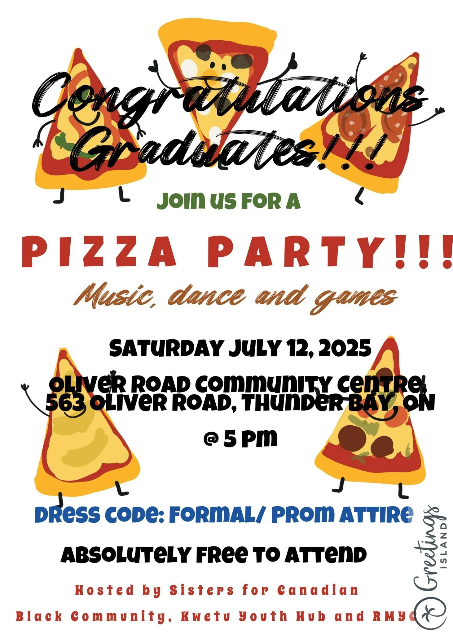 In collaboration with Sisters for Canadian Black Community and the Regional Multicultural Youth Council. we are holding a pizza party for our youth who have graduated this past year. This event is free to attend, and formal/prom attire is recommended!